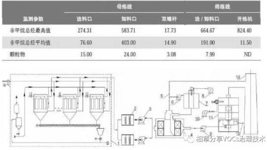 針對(duì)煉膠車間產(chǎn)生的廢氣特點(diǎn),采取“預(yù)處理+濃縮轉(zhuǎn)輪+RTO”的工藝方法進(jìn)行處理,處理后的廢氣排放指標(biāo)遠(yuǎn)遠(yuǎn)低于國(guó)家標(biāo)準(zhǔn),可實(shí)現(xiàn)超低排放。